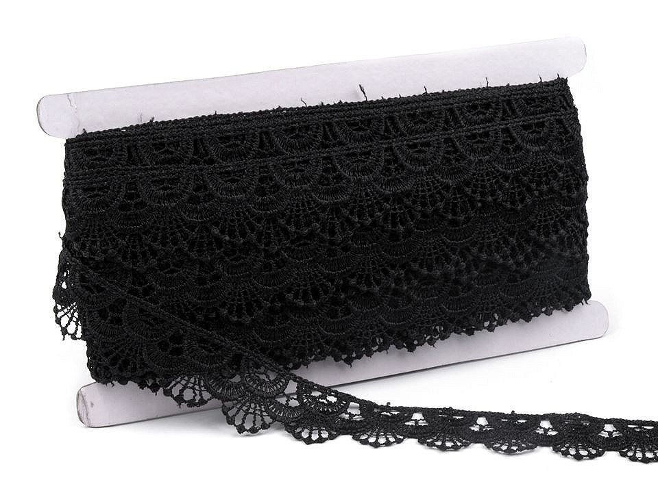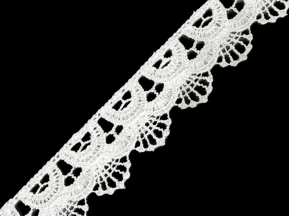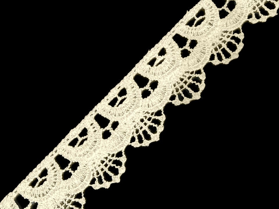 Krajka o šíři 30 mm má zajímavý motiv tvořený z oblouků. Má široké uplatnění. Nejčastěji se používají k olemování ubrusů, deček a oděvů. Může být však použita na scrapbooking.Složení: 76% viskóza 24% bavlna