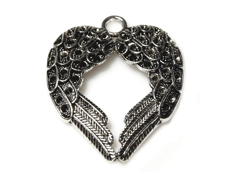 Přívěsek andělských křídel ve tvaru srdce má rozměry 35 x 40 mm. Můžete jej použít pro výrobu náhrdelníku i náušnic. Jedná se o jednostranný přívěsek. Vnitřní průměr průvleku je 5 mm.