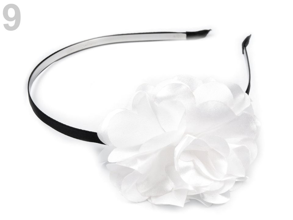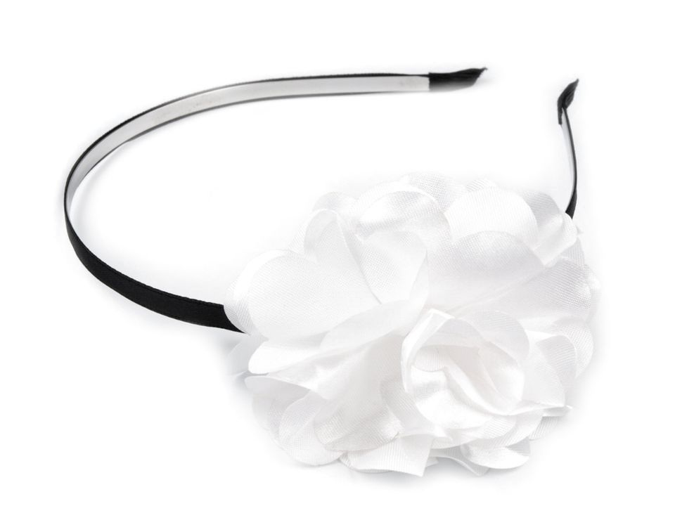 Velmi elegantní dámská čelenka do vlasů s květem o průměru 50 mm. Svým zajímavým vzezřením si získá mnohá srdce. Čelenka je široká 5 mm a potažena saténem. Délka od ucha k uchu je 40 cm. Velmi dobře drží ve vlasech, má pevný stisk. K dostání je v mnoha barvách.