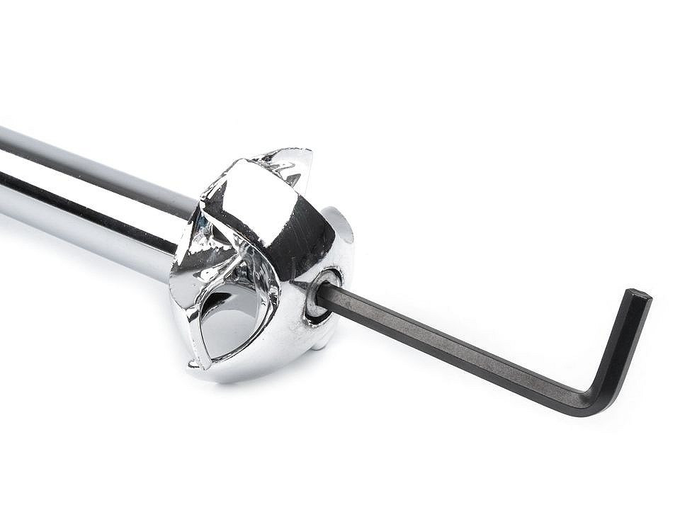 Stojan složíte tak, že si pomocí inbusového klíče vel. 6 povolíte šroub. Vysuňte kulatou část stojanu zhruba do délky 5,5 cm. Poté nasuňte kovové nohy. Viz foto.