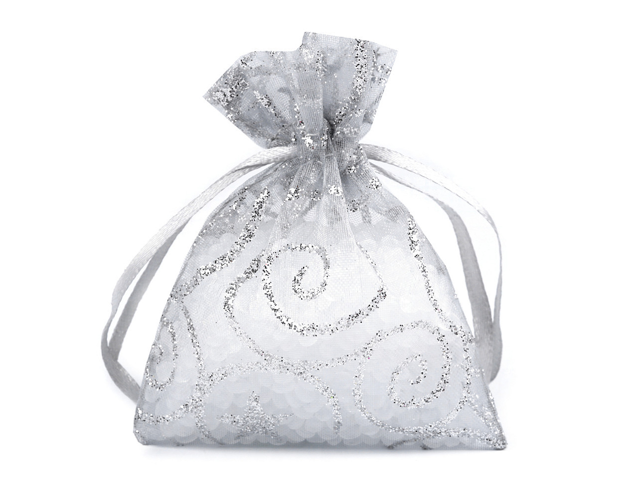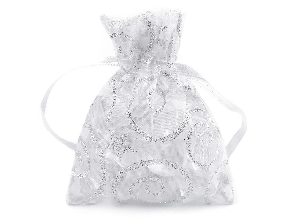 Dárkový pytlíček je vyrobený z organzy a zdobí ho ornamenty z glitrů. Snadno se uzavírá pomocí dvou stahovacích šňůrek.