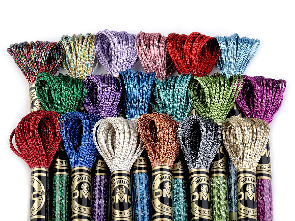 Vyšívací příze upoutá pozornost řadou světelných efektů - zlatý a stříbrný odstín, napodobení drahých kamenů či pozlacení, perleťový odstín a fluoreskující či fosforeskující odstín.