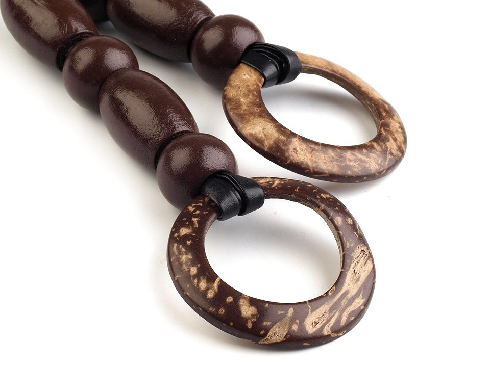 Ucho je tvořeno dřevěnými korálky, které jsou svázané koženkovou šňůrou, na obou koncích opatřené dřevěným kroužkem.