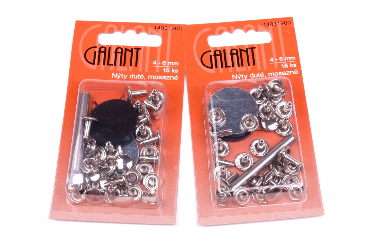 V blistru je 15ks nýtů dutých o velikosti 10mm a tloušťce 4-6mm. Nýty se používají ke spojování kabelek, tašek, opasků atd. Nýtování se provádí lisem, který je součást balení.