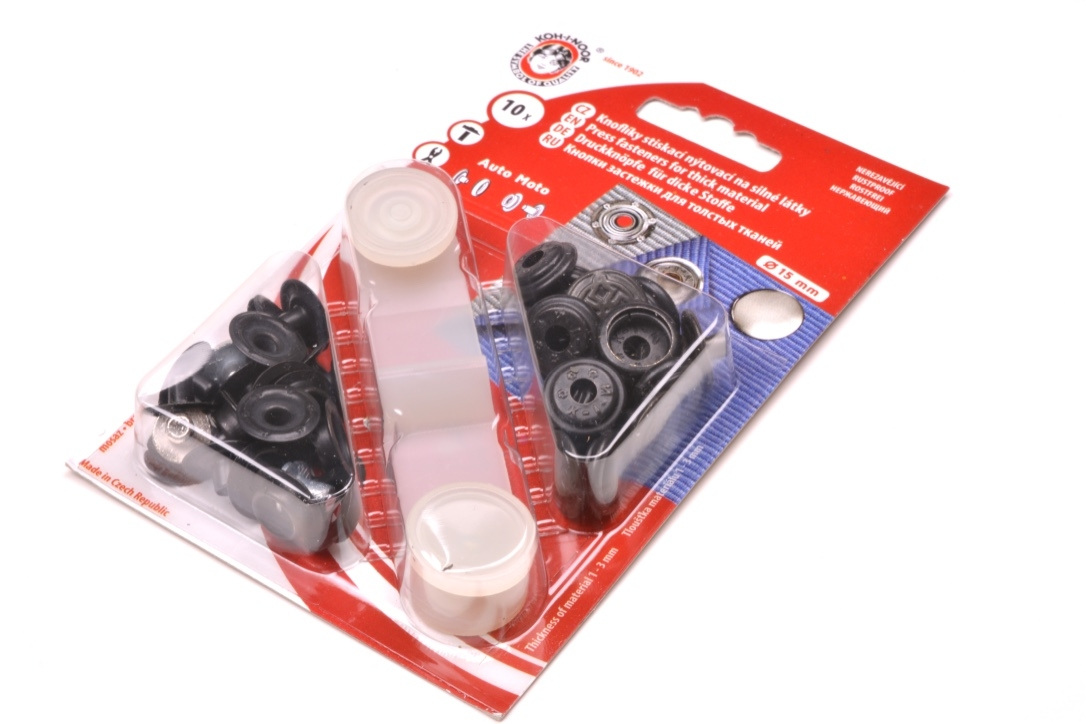V blistru je 10ks nýtovacích knoflíků o velikosti 15mm. Knoflíky se používají ke spojování běžných druhů látek. Nýtování se provádí lisem, který je součást balení. Knoflíky stiskací nýtovací jsou nerezavějící.